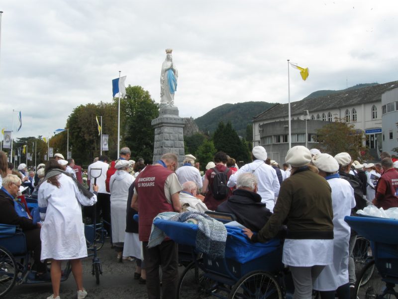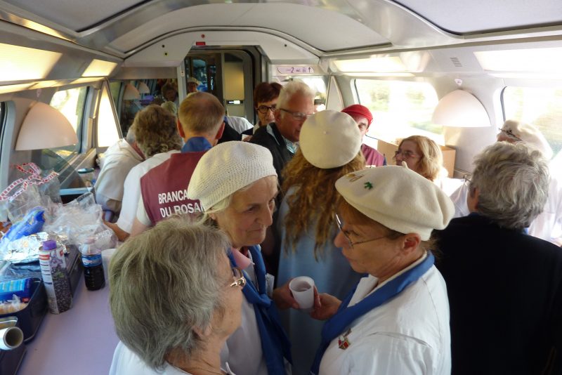 les pèlerins arrivent pour prendre le train et les pèlerins malades sont aidés par les hospitaliers. Une fois partis et que tous sont bien installés quelques uns se restaurent et prennent un moment de repos. A lourdes des moments de prière mais aussi de convivialité avec les plus jeunes.